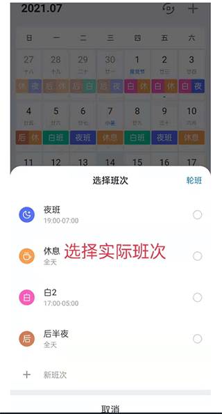 3、设置当日班次,即今天是轮班周期中的哪个班次。注意这里可以选择其他日期。(左右滑动 日期即可改变当前日期) ;