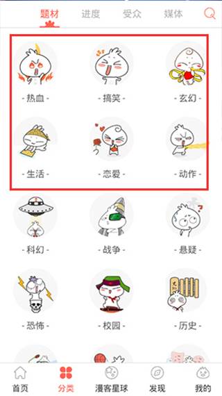 3、点开分类,有热血、高效、玄幻、生活、恋爱等多种题材的漫画;