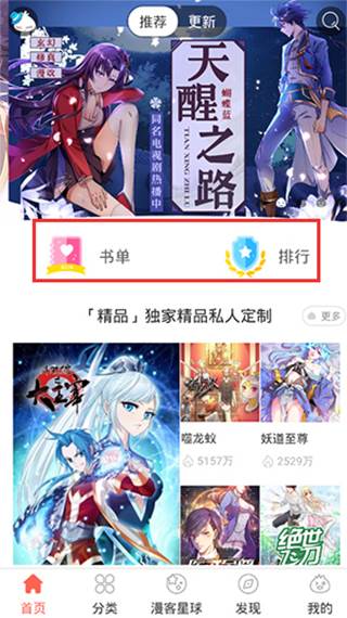 2、在首页,有书单、排行以及软件推荐的各种精品漫画;