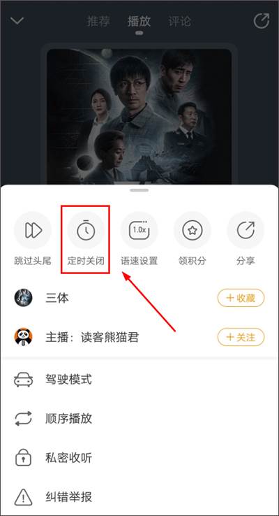 2、进入听书页面,在【播放】界面,点击下图红框内图标,进入设置栏