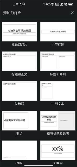 2、编辑好第一张幻灯片之后就可以新建第二张幻灯片了,在添加幻灯片页面选择自己需要的幻灯片样式即可添加。
