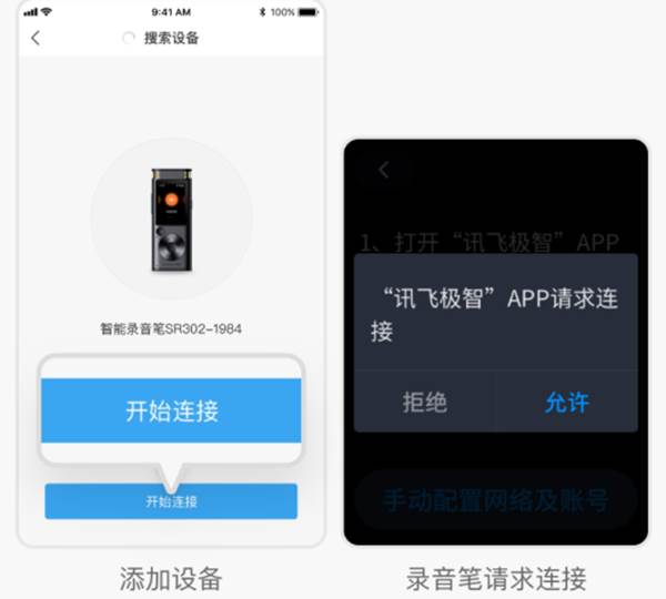 APP搜索录音笔设备,选择【开始连接】,录音笔设备中上滑解锁,点击【允许】完成连接。