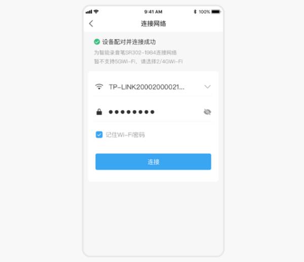 连接设备成功后,选择网络并输入Wi-Fi密码,选择【连接】按钮为录音笔设备配置网络。
