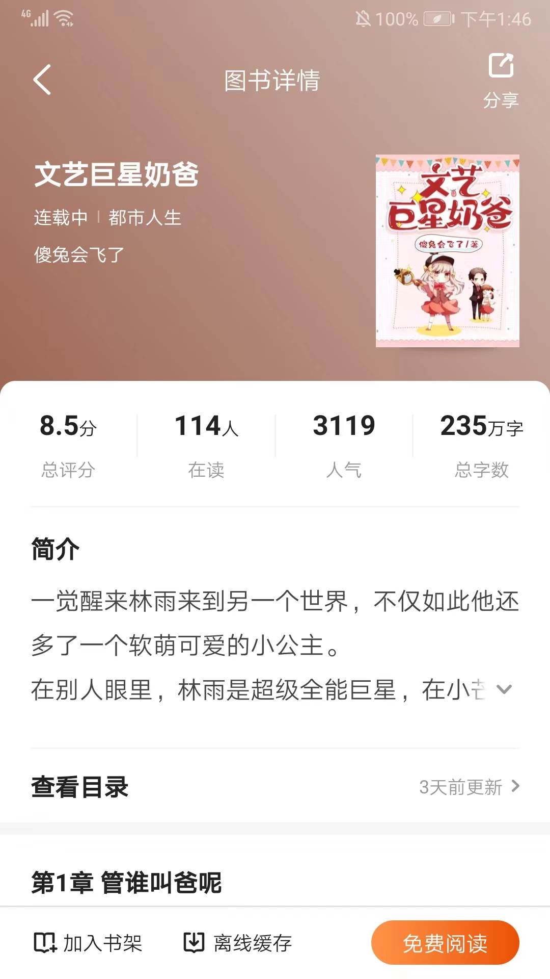 5、这里以【文艺巨星奶爸】为例,可以看到当前书籍的评分、在读、人气、总字数和简介的内容,我们还可以加入书架、离线缓存和在线阅读,
