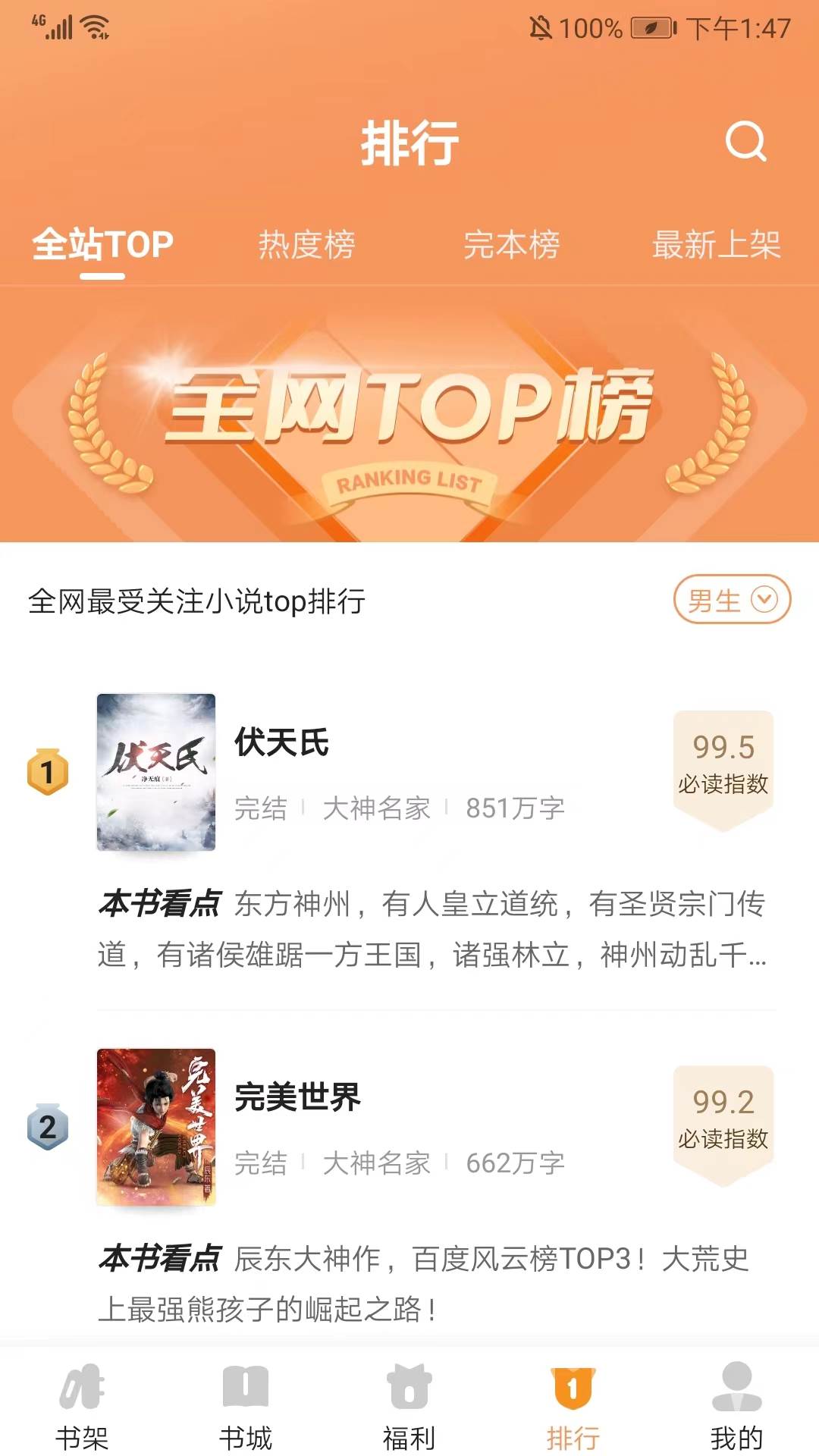 7、进入排行界面,包括【全站TOP】、【热度榜】、【完本榜】和【最新上架】四大排行类型,选择感兴趣的就可以阅读了,