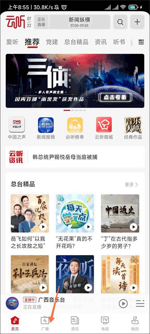 1、首先打开云听app,在首页找到自己喜欢听的音频资源;