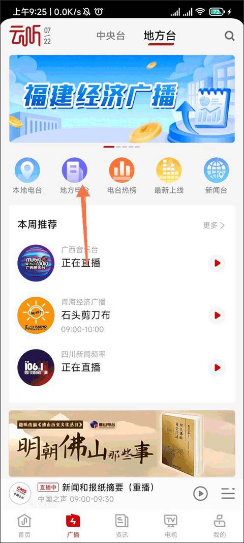 我们先进入app的广播界面,在页面中找到地方电台,点击进去。