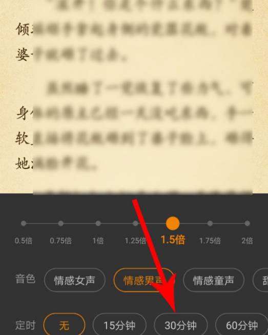 打开听书设置界面点击“30分钟”,然后系统就会开始30分钟倒计时播放语音,到时间后系统将自动停止播放语音。