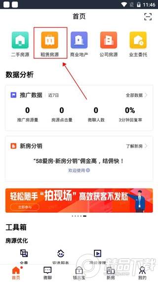 1、运行软件登录后,点击首页"租赁房源"。