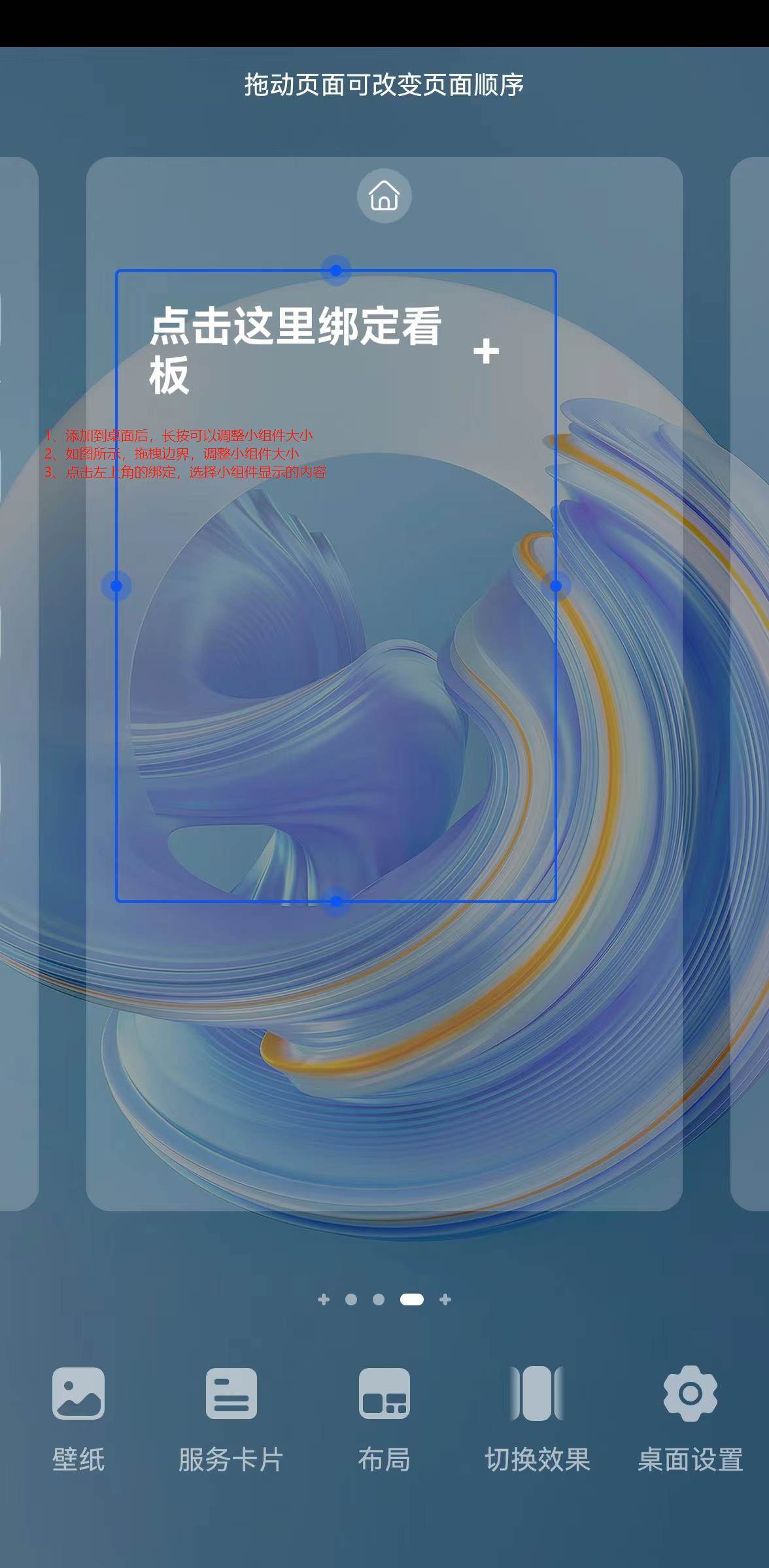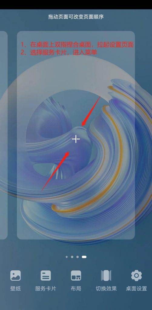 第一步:在任意桌面上双指捏合桌面,进入华为手机桌面设置,切换到有足够空白空间的桌面,选择底部的服务卡片,开始添加桌面插件