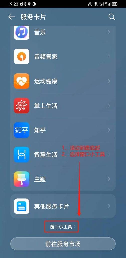 第二步:快速滚动服务卡片列表到最底部,进入到窗口小工具列表