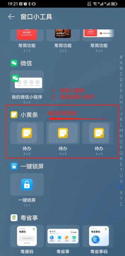 第三步:在窗口小工具列表中找到小黄条,在小黄条的窗口小工具列表左右滑动,可以查看小黄条所有的窗口小工具