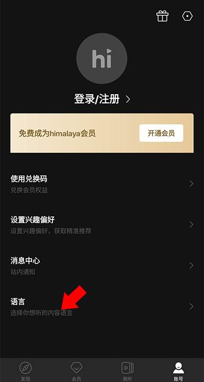 1、从本站下载喜马拉雅国际版(Himalaya),跳过登录等步骤后来到下方主界面,点击右下角“账号”进入个人设置界面