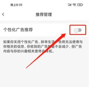 进入推荐管理界面,点击【个性化广告推荐】右侧按钮关闭。