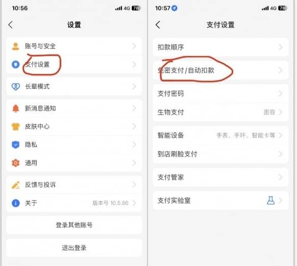 在支付设置页面中,向下滑动并找到“免密支付/自动扣款”选项,点击进入。
