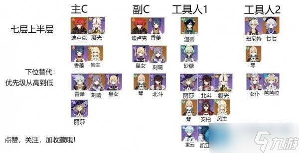 1、深渊9层第一层怪多,第二层怪少,所以如果抽到了温迪,一队一定要带他,班尼特一个大,温迪大招聚怪,丢可莉的炸弹;
