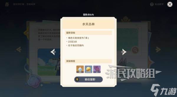 在活动页面找到本活动点击【查看详情】,点击留影点【水天丛林】的放大镜,点击【前往留影】。