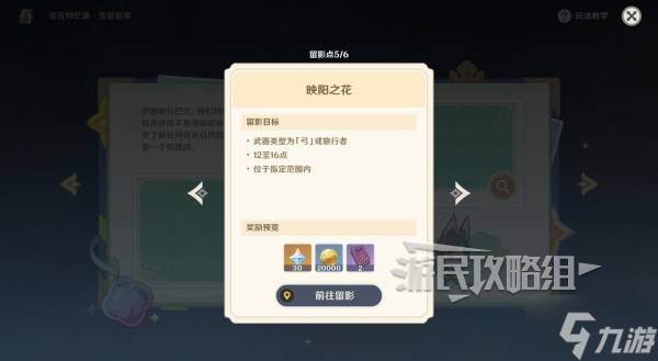 在活动页面找到本活动点击【查看详情】,点击留影点【映阳之花】的放大镜,点击【前往留影】。