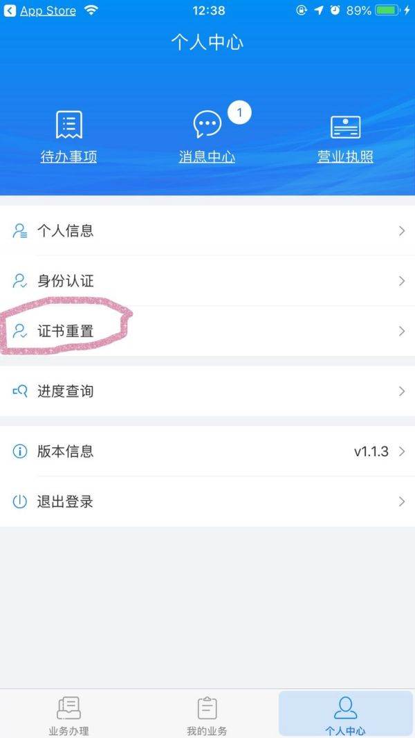 登录后,点击右下角个人中心,先自行设置一个证书密码