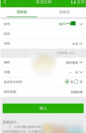 3、定活互转有活期转定期与定期转活期这两种。如果想活期转为定期,那选择填写储种,存期金额等后确认,输入交易密码就可以了。如果你有定期到期了,那你就可以选择定转活,同样根据它的提示操作就可以了。