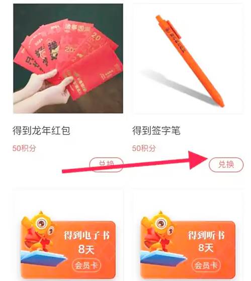 进入积分兑换页面,选择需要的商品点击“兑换”换取物品即可