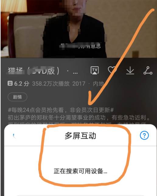 7.界面下方弹出多屏互动,正在搜索可用设备,此时需要打开电视机,同时要保证电视机和手机处于同一无线wifi网络之中。