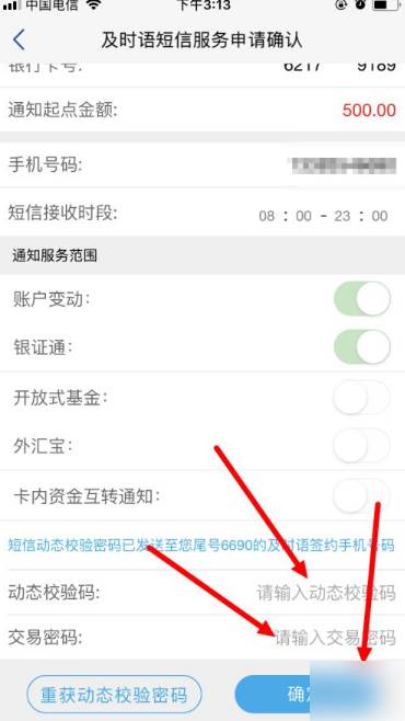 输入 通知起点金额 、 手机号码、短信接收时段 以及 通知服务范围 。