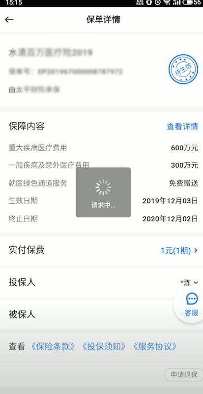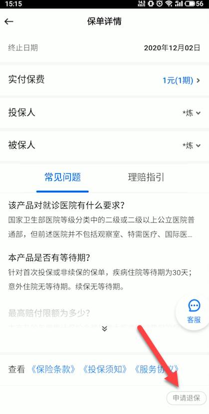 点击*下方的申请退保图标,填写退保理由后就可以退保了。