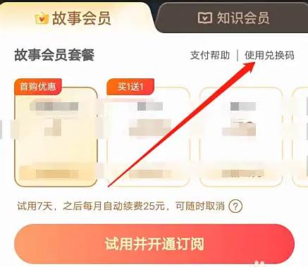 打开安卓版口袋故事的故事会员页面,点击使用兑换码。