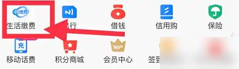 第二步点击中间部分生活缴费(如图所示,红色箭头所指)